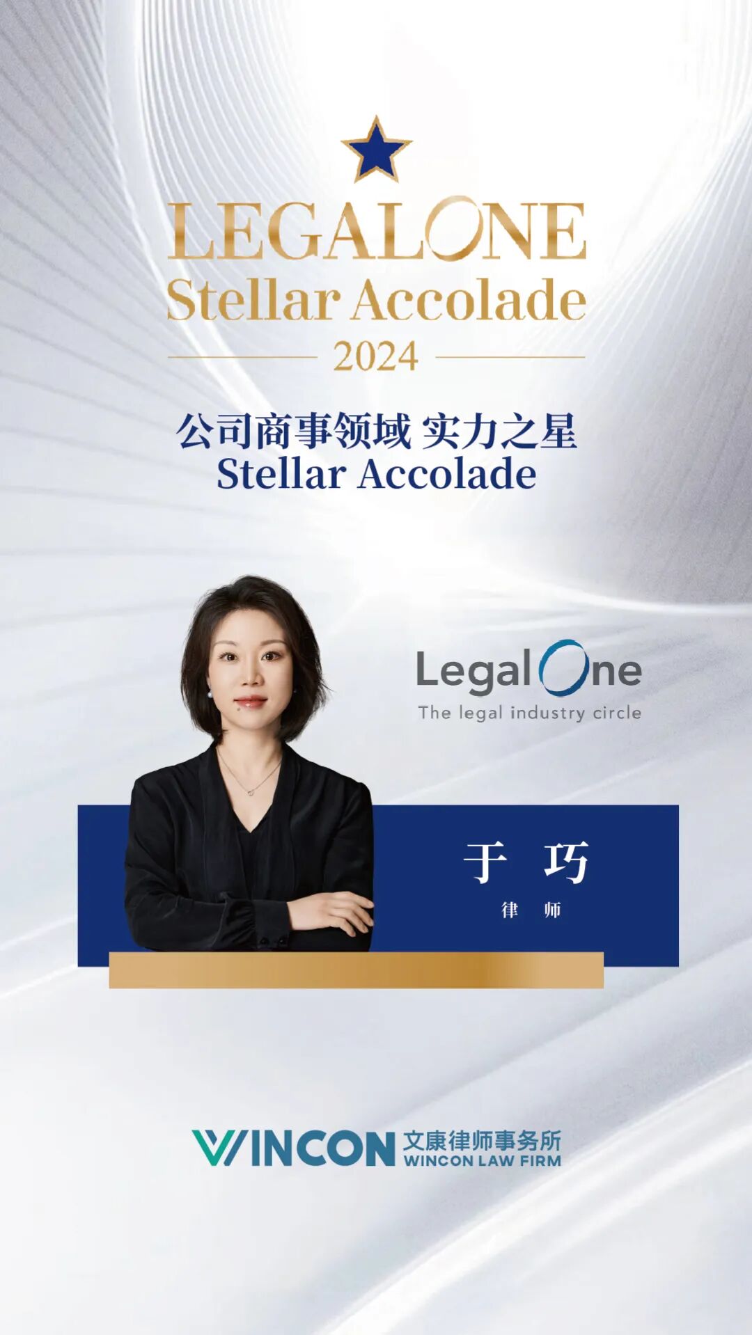 2024年12月31日,国际法律服务评级和研究公司LegalOne公布了2024 中国区“LegalOne 实力之星(Stellar Accolade)”,文康律师事务所高级合伙人、文康城阳分所主任于巧,合伙人姜知泰律师凭借卓越的专业服务荣获公司商事领域“实力之星”称号。