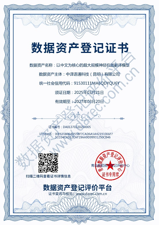 近日,中译语通科技(昆明)有限公司以“以中文为核心的超大规模神经机器翻译模型”作为数据产品在数据资产登记评价平台完成数据资产登记工作,取得数据资产登记证书,顺利完成数据资产入表,成为大模型技术数据资产化的典范案例。文康律所合伙人、数据合规专委会主任马清泉律师、副主任王译萱律师牵头组建法律合规服务团队,基于在数据合规领域的沉淀积累,为该项目提供法律合规支持,创新构建AI大模型数据资产合规审查体系,在“AI大模型+数据要素”融合赛道上的专业服务能力再次提升。
