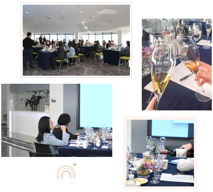 惬意午后,甜蜜香气,馥郁美酒,文康佳人们浅酌聆听,学习了葡萄酒“黄金纬度带”、产区分布,感受酒体在口腔奇妙的融合与回甘,品鉴不同红、白葡萄酒类的酸甜度和香气,搭配着柠檬等幻化出更多层次的口感,跟着老师练习专业的开瓶、干杯手法,畅谈《杯酒人生》,交流酒艺文化,收获别样的美好时光。