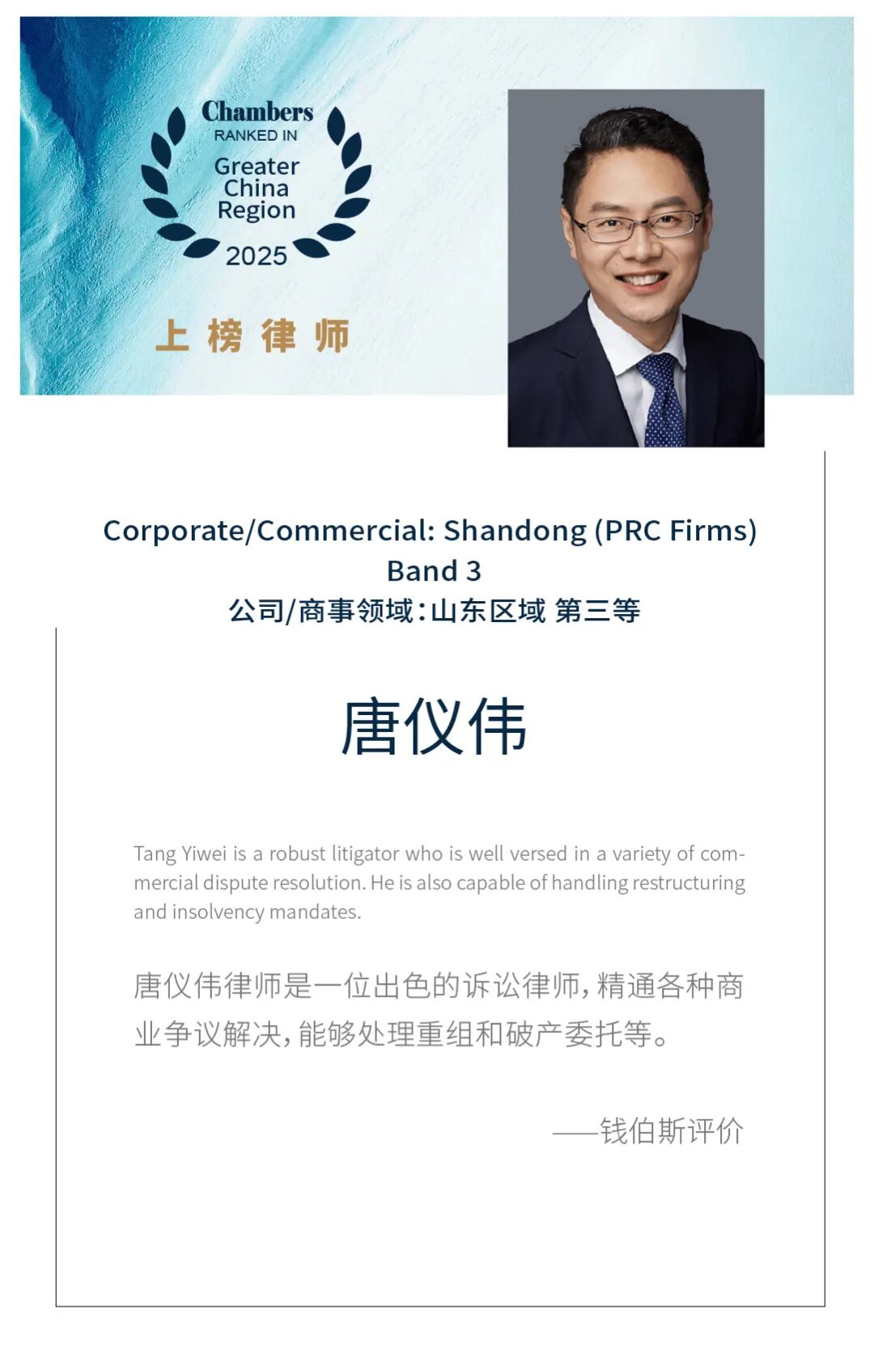 Chambers & Partners 钱伯斯 公司/商事领域 山东区域 第三等:唐仪伟